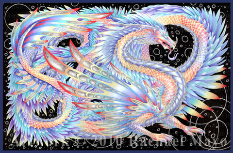 Wow! The colors are so magnificent and alive! The detail is amazing. You have to sit and look at this piece in order to take in all the details. I love the deep reds on the dragon and the peacock feathers as well. Stunning work!