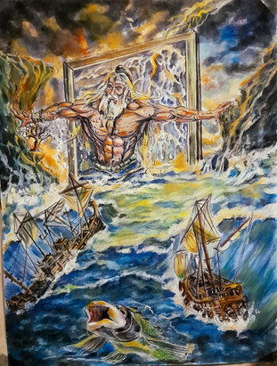 This is a painting I did back in 1995, showing a picture of God the Father creating the earth from the expanse between the waters to seperate water from water. He made the sky out of this. (Gen. 1:6-23) I don't know if any of this is true from a scientific point of view, (probably not much of it IS) but it's a nice picture to look at nevertheless. This painting took me 6 months to do and is hanging above my computer.Related content