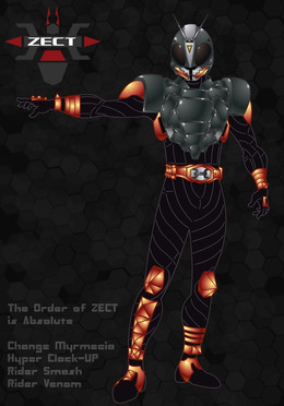 In the center of the city, Kamen Rider Hunter stands in the mist of dozens of dead bodies, severely wounded. Half of his Helmet is broken revealing his face under it, the right side of his chest that allows him to use Gaia Discs is torn, the armor on his right leg is trashed and a giant tooth like weapon is stabbed into his left shoulder leaving it bleeding and paralyzed.