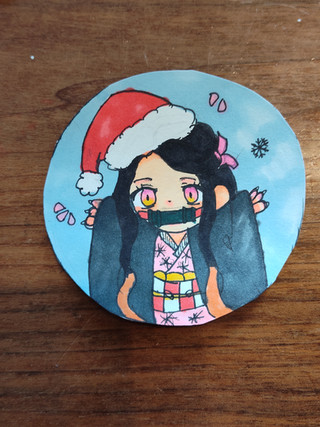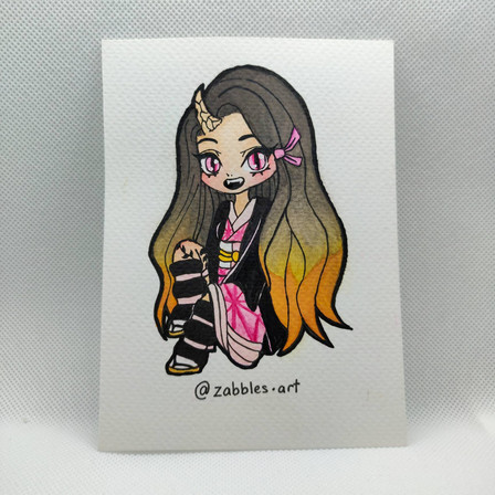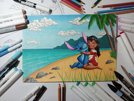 My mom's friend has a daughter who likes Disney and anime, and so my mom reached out to me and requested a themed custom birthday card. Birthday recipient's favorite Disney movie was Lilo and Stitch, while her favorite anime is Demon Slayer, her favorite being Nezuko.I wasn't sure how to pose this so I simply did my best. :>