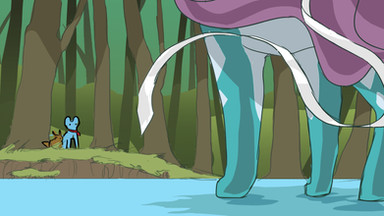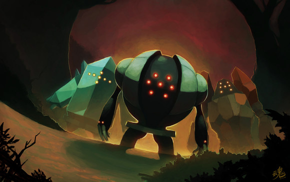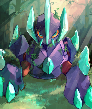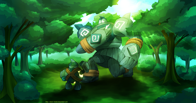The way in which you did this piece, it's just fantastic. I love how noting is really defined--all's just shadow, although they are differentiated by the colors and different hues put into the spot-alike way of shading (reminds me of watercolor!). The perspective and shadows is just such a good thing! You know, Regigigas's dark shadow, a stark contrast against the light above, and the Luxio and Eevee's bright blue shadows makes such lovely contrast against the green! The gradient on the trees, though <3. I just... I'm speechless this is such a good art piece.