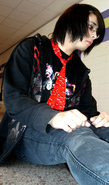 Haha, not here, but he lookes gothic most of the time. And he has a short temper, but he's pretty nice most of the time.
