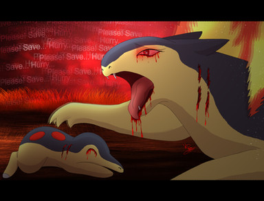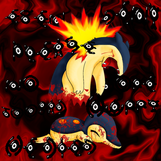Also, Moonscorch isn't bleeding, okay? It's just Lava...... and a mix of blood. I know, I was lying. x3. Oh, and listen to this while looking at it. It'll make sense. Make believe his fire is burning, and stuff like a normal quilava, and something happens, and when the dramatic music comes around the end, imagine this and his fire turned into smoke and lava is flowing down and his eyes widening like in this picture and magical light comes...