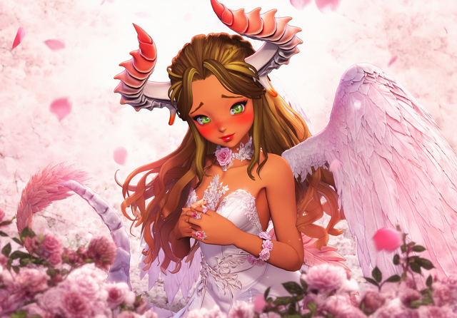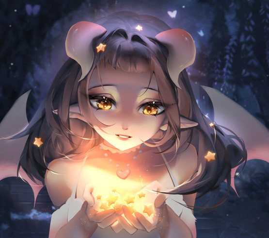 #digitalart #digitalpainting #characterdesign #affectionate #bedroom #blush #bracelet #eyelashes #freckles #hearts #horns #knees #night #shy #skirt #sparkle #steam #tail #thighs #green_eyes #brown_hair #looking_at_viewer #brown_skin #wavy_hair #bare_shoulders #hand_over_mouth #glossy_lips #heart_shaped_pupils #nose_blush #rini_mahi