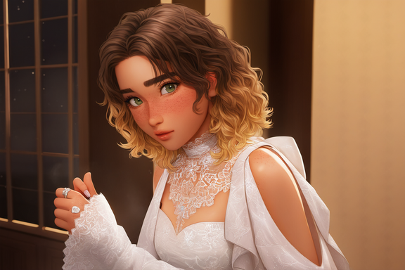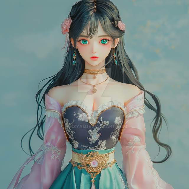 #digitalart #fanart #portrait #beauty #ai #dreamup #bedroom #choker #eyelashes #fantasyart #freckles #indoors #jewelry #kimono #lace #lips #makeup #necklace #pillows #ribbon #smile #1girl #green_eyes #brown_hair #looking_at_viewer #brown_skin #hair_bun #ai_art #nose_blush #rini_mahi