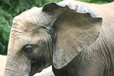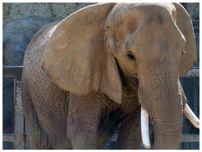 This elephant was one of three at a Renaissance Festival being used for kiddie elephant rides. They showed such emotion for each other... I was waiting for a nearby comedy show to start when I went over to get some shots of the elephants. There were only two in the pen and they were just standing in the middle eating fresh hay. When suddenly one of the keepers asked me and some others to make way while he opened a gate and they brought a third one in from doing the little parade that they do. As soon as the elephant entered the pen all three elephants started making sounds, small trumpets and grunts, and all three let loose their bladders. They took the just arrived elephant over to a shaded area to hose it down and cool it off but while they were manurving her the other two were straining at foot chains that I had not noticed before trying to get to touch the elephant that had just arrived, it was heart wrenching to see. After they had gotten the gate closed they removed the foot chains and the elephants were able to touch one another and you could tell that they were relaxing from it.African elephants are the elephants of the genus Loxodonta (Greek for 'oblique-sided tooth'), consisting of two extant species: the African bush elephant and the smaller African forest elephant. Loxodonta is one of the two existing genera in the family Elephantidae. Although it is commonly believed that the genus was named by Georges Cuvier in 1825, Cuvier spelled it "Loxodonte". An anonymous author romanized the spelling to "Loxodonta", and the International Code of Zoological Nomenclature (ICZN) recognizes this as the proper authority.