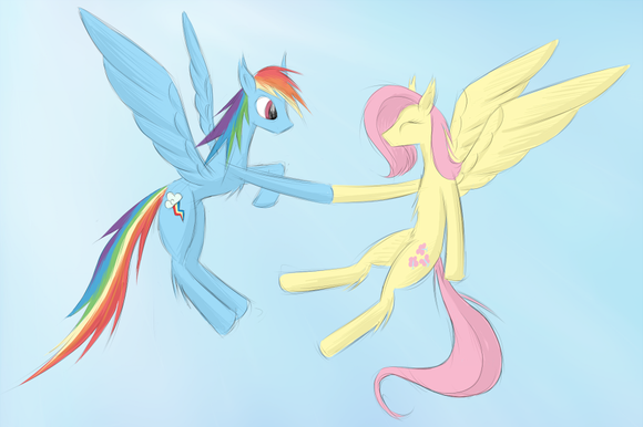 " data-embed-type="emoticon" data-embed-id="357" title="Heart"/> I love it how they look like they are equals, unlike the usual imbalance of power between where Rainbow Dash is more charismatic and flying faster than her. As she laughs she shows that Fluttershy has in fact made her feel good about herself and is enjoying her company as a fellow pegasus, she isn't slowing her down like we usually see in the show. Them flying together is such a sweet sentiment that we rarely see in the show.