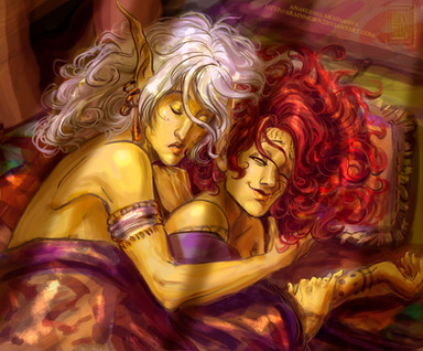 He can not choose to have his woods or not. It's complicated to explain because I'm not comfortable with English. Riddim was in love with Guadrevin, but because of an accident in their youth, Guadrevin had a deep disgust for the woods. The only way Riddim could be with Guadrevin was to mutilate himself, to hide his antlers. He asked Feths to help him. But after years and years of mutilation, Riddim could not bear the pain anymore. He had heard of a magical source, the Source of the Soul, who was healing all the wounds. Including the wounds of the Soul. After weeks of traveling, he bathed in this spring. He came out a year later, without having seen the time pass. The source had healed the wound of his heart. His woods never grew again.