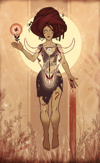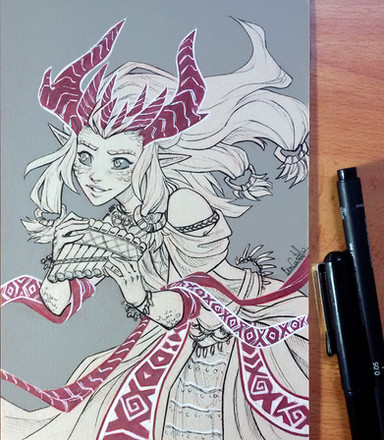 Getting a very Narnian, Mr. Tumnus-esque vibe from this character, with a little Native American influence thrown in to spice things up a bit. It's definitely an interesting concept, and your art does not disappoint I love the subdued color palette of mostly neutral tones with flashes of red here and there. To me, it evokes the feeling of a drawing on the hides forming the walls of a teepee, which lends itself well to the Native aesthetic and almost evokes a legendary quality in the character, as if his is a story that's been passed down through generations using art.