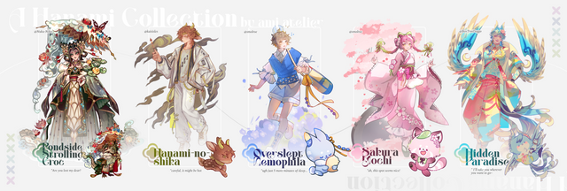 Hello Kitty, Rilakkuma, TarePanda, Monokuro Boo, Tuxedo Sam, Mamegoma, PomPomPurin, Shappo (Sentimental Circus) My Melody, Kuromi, Keropi, Little Twin Stars, ChocoCat, and Cinnamoroll