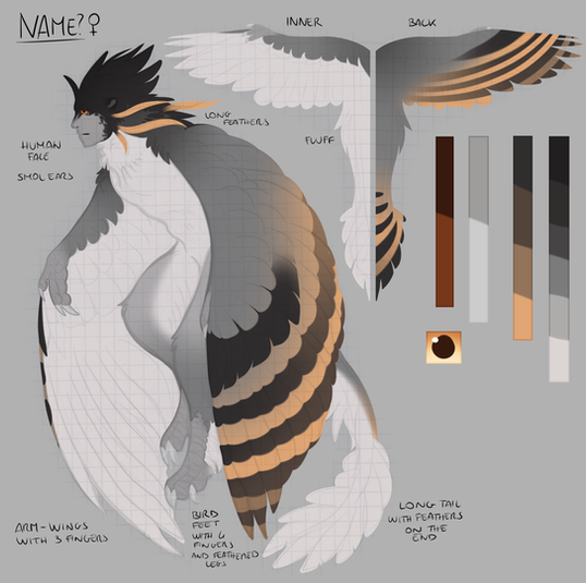 time to make a new reference for my bird girl, its been ten years, and so much has changed! like... the fact she has a long tail no!everything is still pretty much the same honestly, she's sensitive to sunlight, can't chew because she has no molars, and she has no hands so she uses her talons as such for different things as writing or handling stuff.