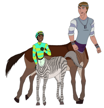 These were originaly meant to be zebra centaurs and that is the reason for their "mohawk" looking hairstyle. That idea was dropped because it took so long before colouration took place - and I simply forgot their original design. By the time I remembered the colouring was already almost done and I had no intention to change it.Since the centuars have dificult anatomy I was playing around with the idea how such creatures would hold their infant without making them look weird.