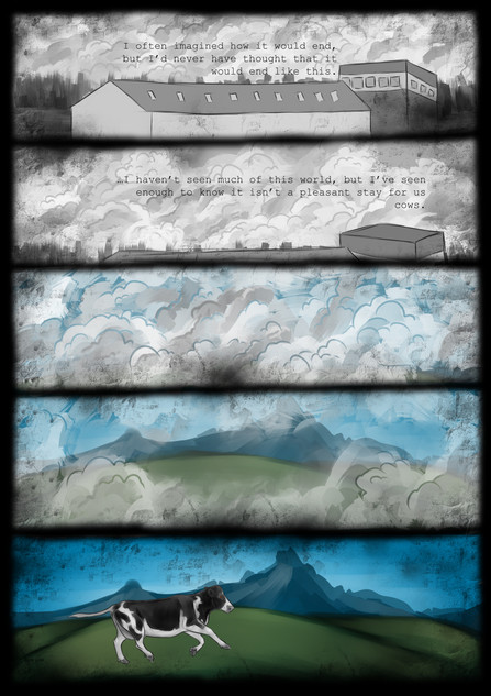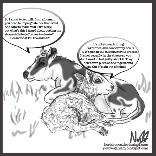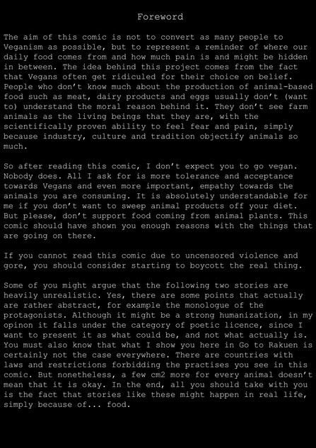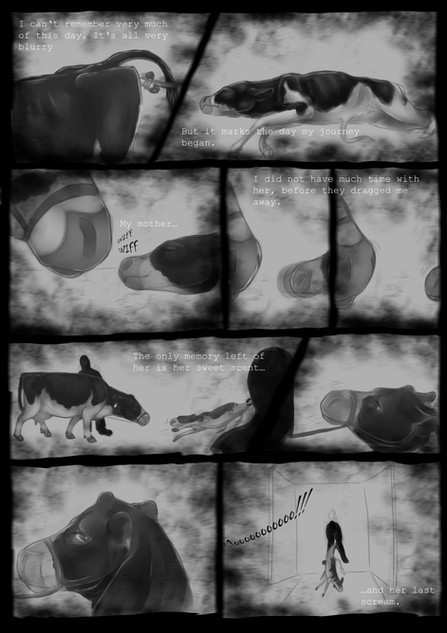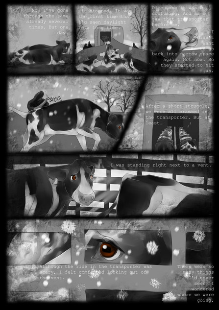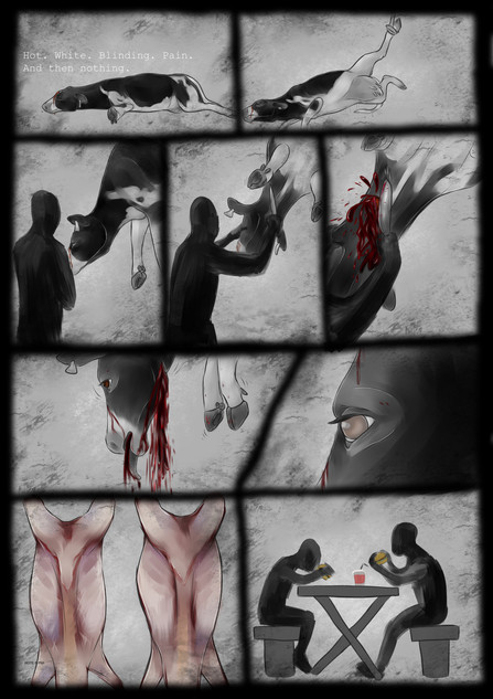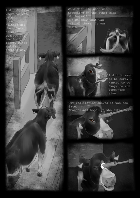 I see that all these procedures have their purpose (although that doesn't excuse them being done without anesthesia, like it is often done in the business, and shown here in my comic), but I think we talk here at cross-purposes. My point is not to keep on doing animal husbandry without all these painful interventions, and try to improve or justify this or that. My point is to avoid it all together, because what the agrar-industry is doing is either painful to the animals or the humans (like you said with the dehorning, or keeping bulls uncastrated). This is a vegan comic, not a vegetarian one. I'd rather have no cows existing than to forcefully breed them into existence, only to have them go through unnecessary pain and slaughter them at the end. You say cutting off their horns and testicles (without anesthesia) is the only the best for them, but it's not. It's the best for the humans who want to consume them for their pleasure with as little inconvenience as possible.