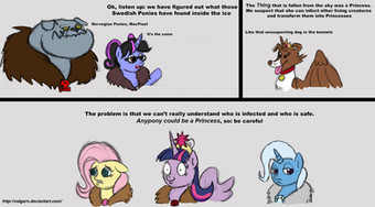 (Okay for those who won’t understand the references: 1) The pony at the top is Commander Firebrand aka joshscorcher , an MLP reviewer who has two Youtube shows: one where he’s just sitting on his actual real-life couch, and one with his above ponysona. The idea of swapping the two for this universe-reversal was too much fun. 2) The click-tab of Silver Quill is a random joke based on a video of his I saw once, where he was reviewed live at a pony convention but wore a hippogryph mask to hide his true identity. XD; They’re the only two MLP reviewers I really watch, because they’re funny, clean, and usually pretty insightful.)