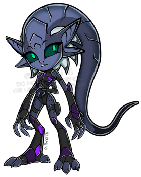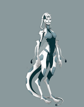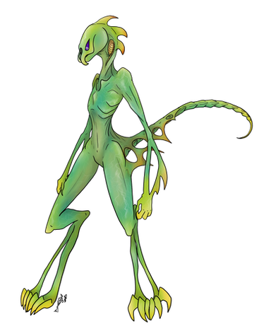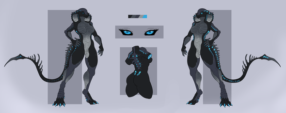 A quickie redesign of one of my old characters, making 'her' more of a Reptilian / Insect hybrid alien type. Her skin is more scaly leathery than Chitin in most places, only the darker blue parts are actually HARD chitin plates and even then there's still some flex near the root.Once again I have no idea why, but I like how her feet look. And as a twist of something I don't normally do I gave her the whole separating mandibles, all insect / snake like.