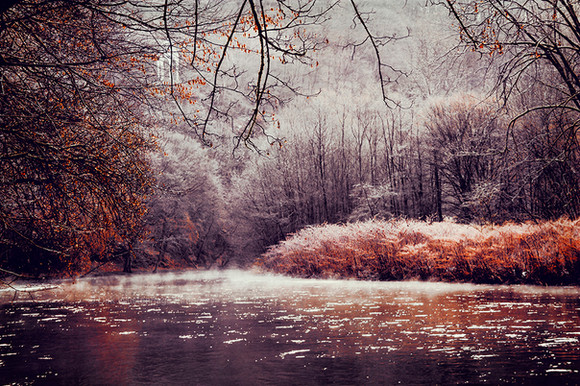 Fantastic landscape! The sky, the water of the river and the hoarfrost on the trees are united in a single color harmony. And this magical nature is beautiful!Β Β