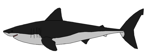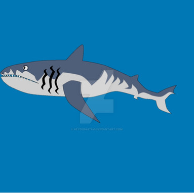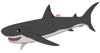 Another one of my orginal characters. This is Rex. He's a Pacific Great White Shark. By Pacific that means he's from the Pacific Ocean, near California. One thing that was mentioned on one of the documentaries during Shark Week on Discovery channel is that Great White Sharks from the Pacific, like say around California are bigger and heavier than their cousins from Australia and South Africa.Personality wise he's compassionate, understanding mild tempered, and has a forgiving heart. He is somewhat skittish around people having washed up on a beach when he was a pup and two people who happened to be both surfering and worked at a local city aqurium picked up. Although they released him back into the ocean, Rex wasn't keen on being around people, this would include going after scraps or leftovers tossed overboard on boats, unsold seafood from fish markets or handouts from divers. Normally, other sharks wouldn't pass up getting a free lunch but Rex kept his distance from humans. Once fully grown, he ran into one of the aqurium employees who helped him and gradually learns to trust people. He's still skittish but now eats out of a person's hand and allows himself to be petted, though he hasn't allowed anyone to pet or hold him long enough to put a tag on his dorsal fin.