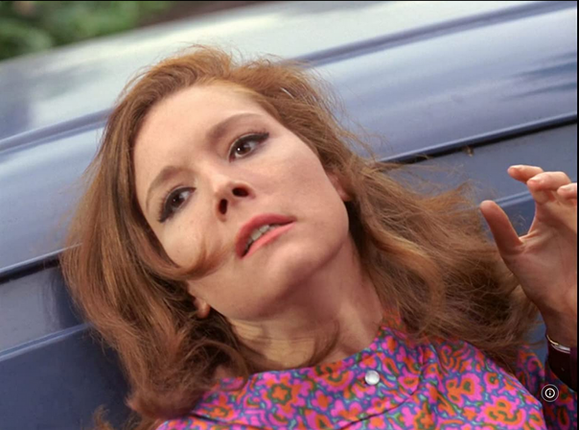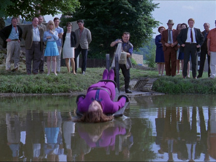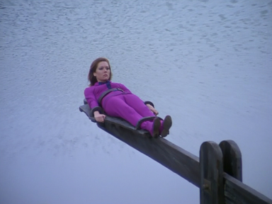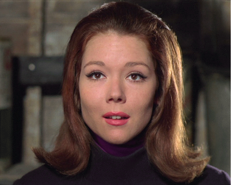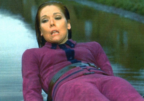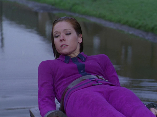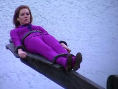 There was the defiant Mrs. Peel, clad in a snugly-fitted bright-colored outfit, strapped by her wrists, ankles, and belly to the dunker. And when she emerges, rather than looking a disheveled mess, she looks like she's emerged from a pool or a bath.