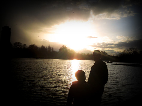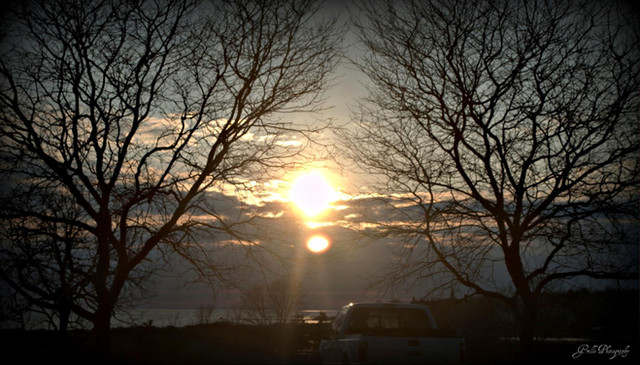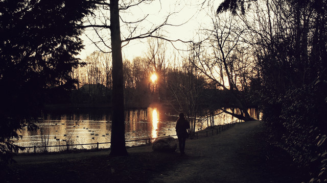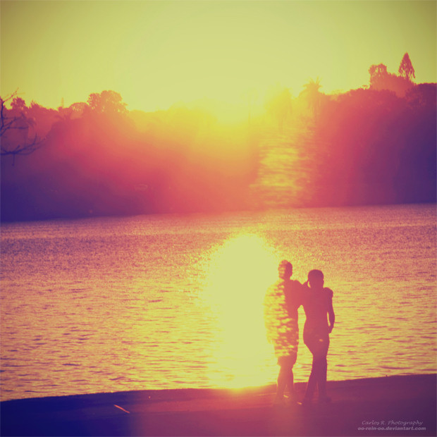 Very nice shot! I love the lens flare. The composition is great too - the way the sun is 'framed' on both sides. The way the light gilts the womans hair is nice.