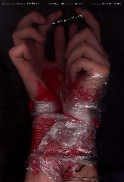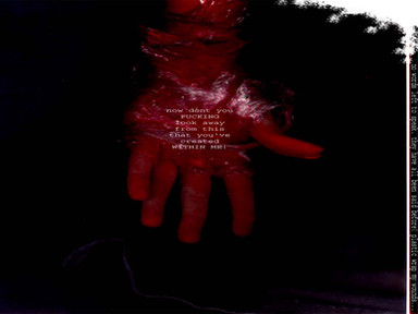 this is the orginal image of my dev hand #2... but to go along the lines ofthe idea of the deviant hand i added a lil poem short but to the point like most my stuff as of late... like i said before its paint and plastic wrap yay! i got a single hand shot too that i will upload... comments?Related content