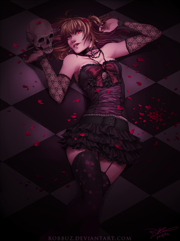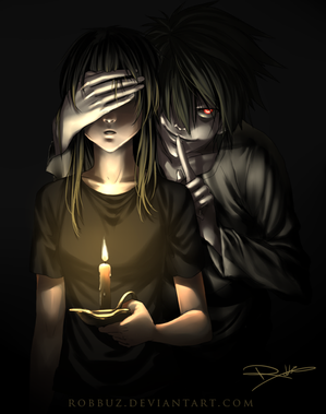 This is such a beautiful piece. The lighting is perfect, the coloring is beautiful, and her eyes are so striking and dangerous in the gloom <33 You wouldn't even know it was a crossover since the characters look so natural together the way you've drawn them.