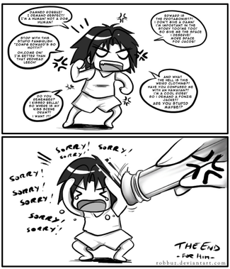 Recuerdo que este fue el primer fanart de "twilight" que vΓ... de eso ya hace mucho aΓ±os... mucho antes de que "the twilight Saga" se convirtiera en la cosa superficial y mercantil que es ahora. Este fanart siempre me alegra el dΓa, me hace reir muchisimo.