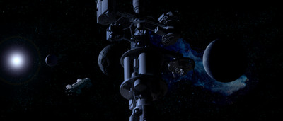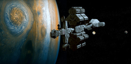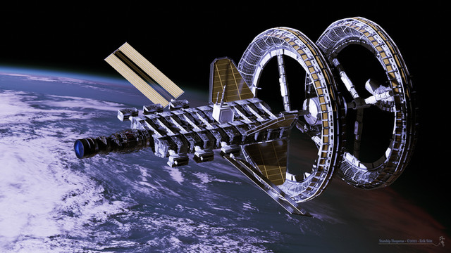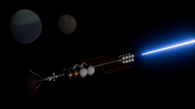 Thanks! The inspiration is of course the Discovery from 2001. So the basic idea is of a bunch of modules, which would function as engines, fuel storage, consumables, centrifuge/habitat, and so on.