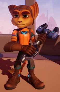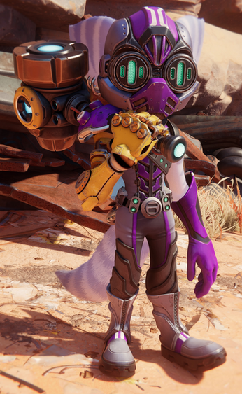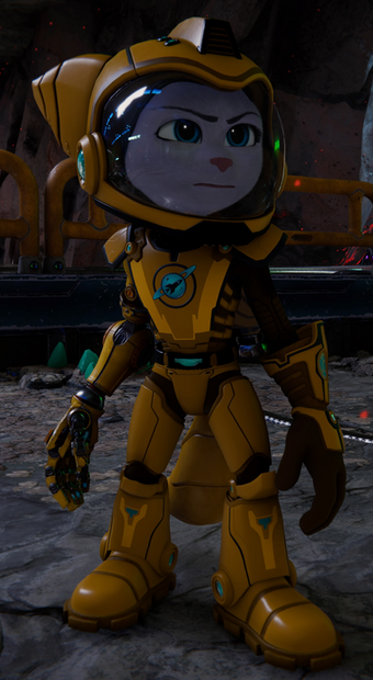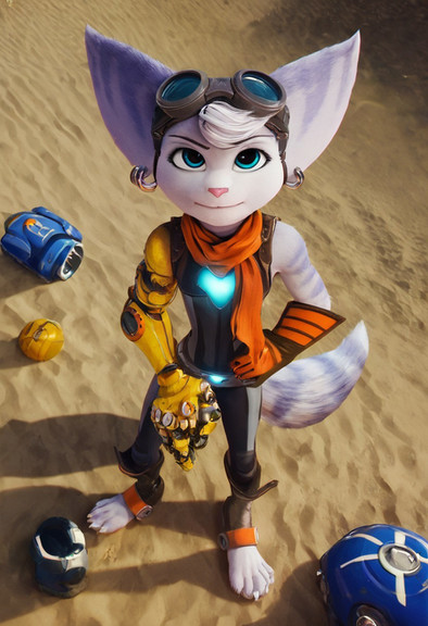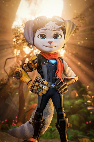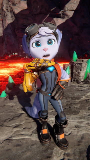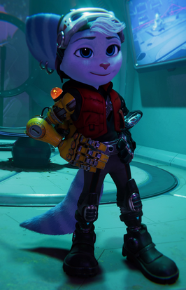 Rivet the Lombax in her regular jumpsuit with her cybernetic arm