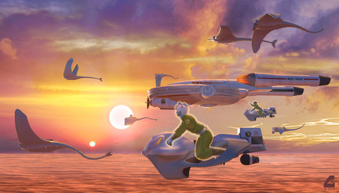 This is a composite piece - 3D foreground elements with 2D background (didi_mc's "Outer Rim 2"). Rendered in DAZ Studio and postworked in Photoshop CS.Related content