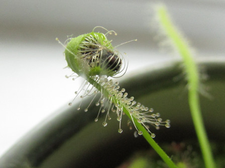 A fly, butterfly, or other nectar-loving insect will find the sweet smell of the mucilage that oozes from the plant. Landing on the colorful tip, the insect will immediately be stuck. The plant has cells that make more mucilage in the place where the insect is. The gooey mucilage will completely surround the insect. Then, the sundew plant wraps its outside tentacles around the insect, absorbing its nutrients. It curls its tentacles around the insect quite quickly: in some species this takes only a few seconds. Some species, like Drosera glanduligera can curl its tentacles towards its prey in less than a second.Many sundews can bend parts of themselves so that the prey will be as sticky as possible. One species, Drosera capensis, actually wraps its leaf around the prey in 30 minutes, as seen in the picture on the right. The prey usually dies in about 15 minutes. The sundew will then eat the entire insect except the outside exoskeleton. When the plant has finished eating, it opens up its tentacles and drops the exoskeleton to the ground.