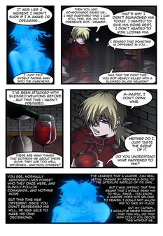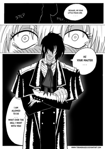 Ohhhh I'm sensing a really good reference here! I like how you added the scene with the brides and our Count. It gives more emphasis on a sort of urge Seras has, something similar to in the manga where she's just trying to maintain control when she didn't drink ANY blood. I really love this page as one of my personnel favs in this doujinshi, and I absolutely am still in love with the art style. It feels like there are traces of Hirano here