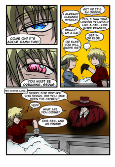 Interesting viewpoint. I belive, that making a fanfics is great practicing for future writers. The problem is that not everyone has the talent/fantasy/empathy to understand and fell the motives and emotions of a fictional character. If someone is not capable of that it doesn't matter if they write a fanfic or something on their own, both will be a mess. More problem is, that lot a fantasyless people start to write fanfics, because they got inspirated, but they don't have the ability to create characters on their own, but they have their own opinions and they put it into an used character. The result of this is when a rapid Alucard fangirl replaces Seras original personality and draws Alucard and Seras making out. That's because she can't think about it what Seras would do, she can only image what she would do in a situation. Writing stories on their own won't change this persons. But back to the subject. In the manga, Seras calls Pip pervent and she really means those words, don't look at Pip otherwise than a bloody pervert. And Pip singing filthy, pervert songs in front of a girl like Seras clearly gives the impression of a pervert, and that's the reason some "gentleman" fans don't like him and think he don't deserve Seras. However, I don't think he is really pervert. Maybe uncivilized, because he spent most of his life on battlefields, he doesn't really knows how to treat a girl like Seras. Their relationship will change when they get better know eachother. And it's not really hard to make a fanfic. Maybe they are many theories... but not many of them makes sense if we look deep into the manga and read interview with the creator. And by the way, I'm not really sure why are you telling me this in the commentbar of my comic. Have you now some problem with my fancomic and the way I use the hellsing characters, or do you just have problems with fancomics in general?