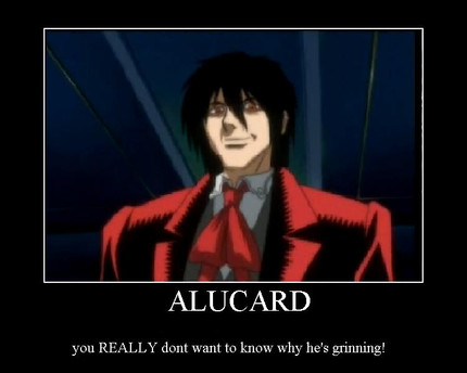 I glad, you see it this way. It's true, time first time I've seen Hellsing I became obsessed with it, and I just realized once that I start to image total side stories. Of course I always had a wild imagination, when I don't like something in a movie, or a book, I always started to wonder how I would've ended it. But Hirano and the way he paints the story like a ballad, I was able to learn how to built up a character. Many things remain obscure, it doesn't matter if we don't know many things about the character, all it matters is the way they act while they are on the screen. At first I thought that the relationship between Seras and Alucard is more... emotional. I actually drawed some AxS fanarts. But when I've read the manga to the end, I saw Seras more like a daughter character. I mean... Alucard came back after 30 years and what was the first thing to do? Go to Integra. And when Seras came in Alucard just said angrily "you are noisy as always" :rolf: Like an angry daddy whos private time has been disturbed by the annoying child. Besides that, I don't think Alucard deserves Seras if she is only the second girl in his life. But of course like you said, we can see these characters different ways. It is possible that Alucard visited Integra first just out of respect.