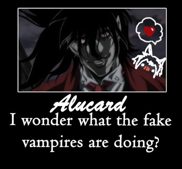 So that's it, he described their relationship as "complicated", which isn't actually romantical. In the other hand, there was an other interview where he stated the relationship between Integra and Alucard as "master and servant, and twisted/sick love" (depends on transalation). Of course that is not romantical either, since this "sick love" is only based on Alucard's fanatical respect towards Integra. To think about it that Alucard's respect and Integra's trust towards her servant was enough to consider this pair as "sick love", and at the same time the situation between Seras and Alucard wasn't even considered that way, just simply "complicated" explains that Hirano approves IxA but don't really care much about SxA, which doesn't mean he is against it, it just means that is not the way he wanted to make it look like in the manga. So, even if there is something between them that is at most "platonic" just like the relationship of Integra and Alucard. Neither SxA or IxA is actually happening in the manga, nor in the OVA. That is the canon explanation.
