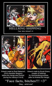 I've read the manga like 500 times, watched every OVA like 100 times. I think I understand the characters, their personalities and the meaning of their presence in the story enough to tell, that there is ABSOLUTLY NOTHING SEXUAL between the Master and his fledgling. I'm a hellsing fan, and not a fan of a made up pairing. But that doesn't make me the enemy of that pairing, there can be amazing, lovely, nice stories made of these two, BUT don't tell me that you are 100% sure that this is going to happen, because it's fanfiction, and every fan has his right to belive what they think is going to happen.