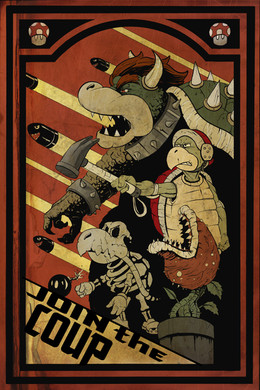 Anti-Mushroom Kingdom propaganda from the Koopa Kingdom.I tried to make up a symbol for the flag that vaugely looks like the one on the original Super Mario Bros ( [link] ), incorporating the honeycombed hexagon pattern of a koopa shell. Someone told me afterward that it was supposed to be a skull on the flag... Oh well.