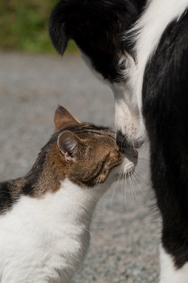 in the past (and even today) cats and dogs generally are not supposed to get along. look in cartoons, movies... everywhere.well this cat raised this lil dog. stinky, the cat, loves her so much. she runs after her when they are in the yard. just so stinky can rub up against her. they sleep together and snuggle and even play.