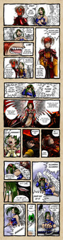Something that really always catches my eye is your use of color. I love how the first panel/fear story is just red. Red in the background, tinted with red in the foreground. As a vibrant color, it really conveys the raw fear of a child excellently. Then it progresses to the cooler color- the green of the second fear story. It conveys the bitterness, and the less abrupt fear of Bendam. Then you move to the fear of Rhi, subtle, certainly, and the warm and cool colors are swirling everywhere. Like a metaphor describing her fear as a mix between the child and the adult. Yet then she takes those fears and uses them as a weapon, as motivation, and in that moment it's like the color explodes warm and cool. She turns that fear into courage. And, as you described her, she is bad-a.