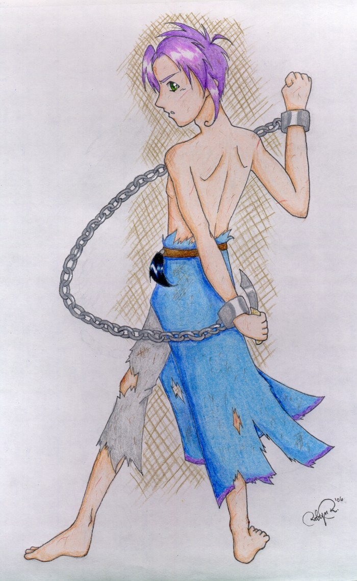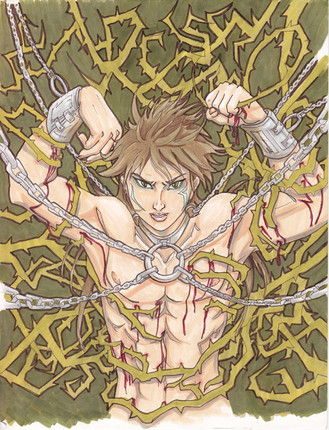 I tried hard not to get out of the lines too much, as is my habit, although I was looking for a more rough look, like in the background (which was actually very last minute, oops!). I was also looking for a more dynamic shading, so it looked kinda like cell shading, but kinda not. I tried to get the metalic look on the chains and knife, although I'm not sure if I quite got it right. I used white acrylic paint to do the highlights on the chain links and in Hedran's eye, which made me consider putting it in the "Mixed Media" spot, although I eventually put it here, like with the rest of my pictures. Where to put the shading and highlights was a big pain, as I was undecided on where the lightsource would be exactly. The chainlinks were a big problem during inking, and quite a few ended up rather warped. If anything's going to boot me out of a good place, it's those two things. However, my hopes are still high. :3