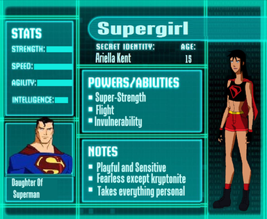 Galatea shared the same powers as Supergirl yet, due to her accelerated growth and the specialized training she received at Cadmus, she possessed superior strength and skill to her counterpart. , Galatea seemed to favour heat vision as a primary offensive ability and used it with great skill and accuracy. Her heat vision also seemed to exert far more concussive force than Supergirl's. she's also has an immunity to Blue kryptonites temporary power stripping due to her DNA being infused with it.