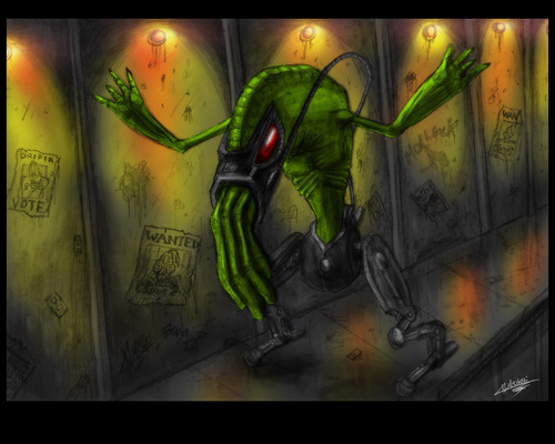 I happened to have been listening to "infected mushroom" when drawing this....This was what happened during his torture whe he was two years old..he seemed to have started growing fast too. Crome first had a maroon colored PAK like every other Irken but it was taken off by scientist and he was hooked up to a life support almost brain dead, before scientist made him a new bluish colored PAK. He was tortured merciless, was cut open and restitched back up whiched caused severe scarring across his chest.