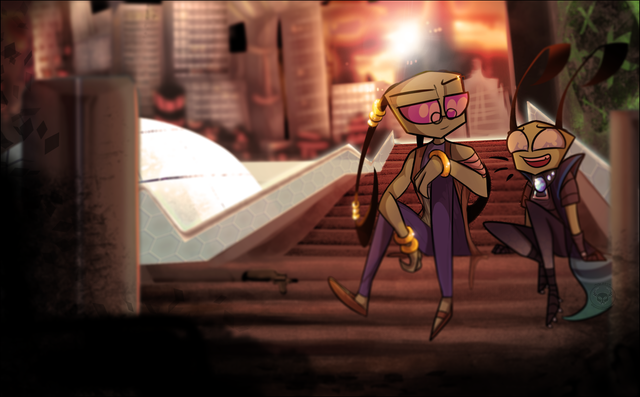 Supposed to be one city stop Crome and Rayne make in my comic Irken Corruption. Still need to continue that thing.This comic based shading style was a living hell to pull off. It is extremely time consuming and by far difficult to do since black is a very uncomfortable color to use as shading.