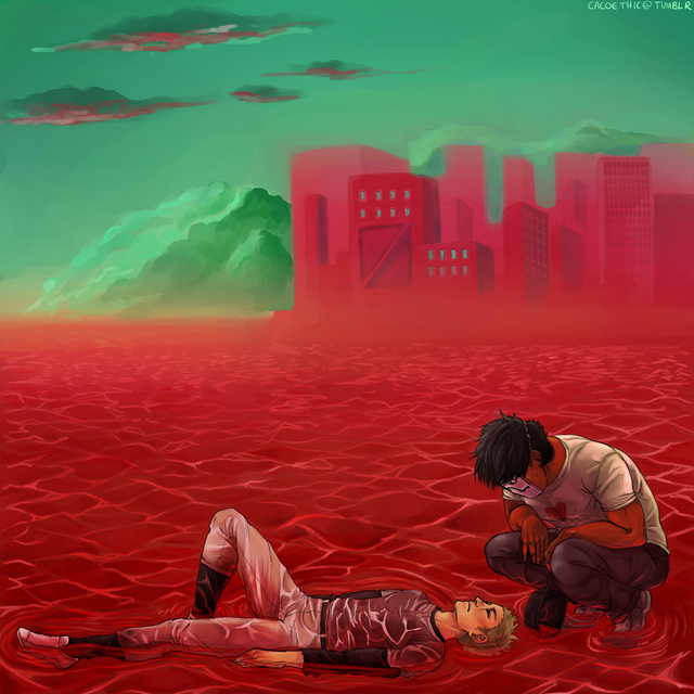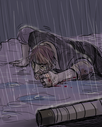 Argh, so much to love about this~! I'm seriously so jealous of how you can draw someone falling to their knees like that. The perspective of how their legs look as they get farther away from the viewer is absolute murder for me DX And you just nail it! And the folds in his clothes as well as his bloodstains all look so wicked cool, especially how they mesh in with his pose so it doesn't look flat!
