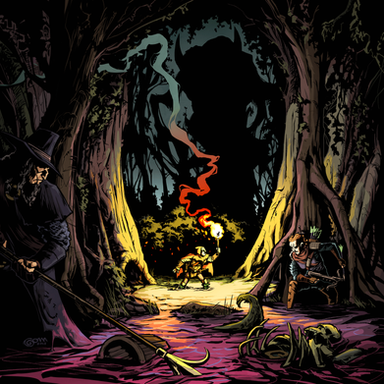 It has a very Secret of NIMH feel. I love the composition, especially all the black shadows revealing a slice of bright orange sky.