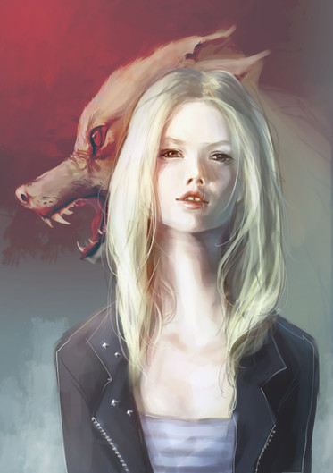 Love the eyes, love the unexpected twist of the rabbit's head and the connection between their hair/fur color is a nice touch giving it an icy, creepy feel. Frankly this looks more alive than the reference.