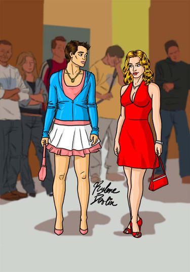 Another great drawing - one can imagine his gorgeous girlfriend will not be taking any nonsense from her young man in their future relationship. Perhaps she realises she has found herself a sissy maid for life.