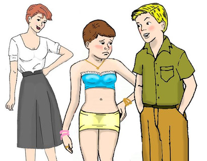 I really, really want to see the "past" version of this -- with the mother and "son/daughter" sitting for the portrait in matching full-skirted dresses... or a peek at mother's photo album, with pics of her cute young lad dressed as a lass in various forms, perhaps a prom dress or something like it... Love this pic the most!