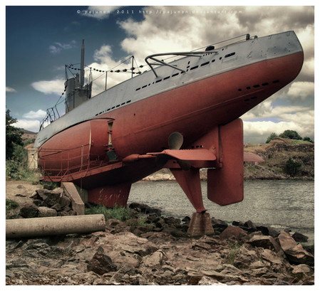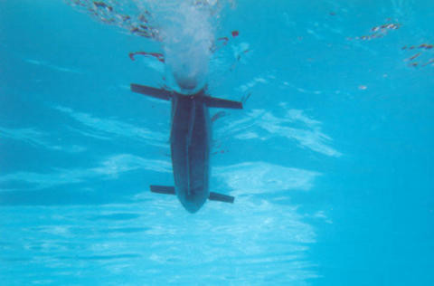 With a good wind on 2 loops of 3/16 inch tan sport rubber for those stick and tissue model airplanes, the sub will travel the length of an Olympic sized swimming pool with what might be called the central 3/5 of the distance underwater.On the pool at the apartments where I lived when model was built it would tag pool's far end while still as much as 4 to 5ft down, or call it, as much as a meter and a half down.