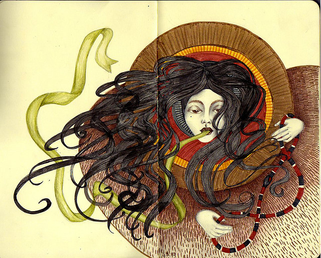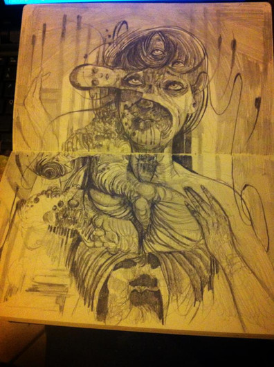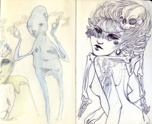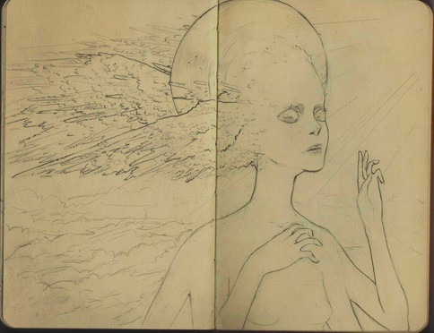 drawing in the sketchbook. It's mostly pencil with a bit of coloured pencil. The neon colours are generally pastel crushed up and applied with water and iridescent white.It was a huge struggle and I'm happy to move on