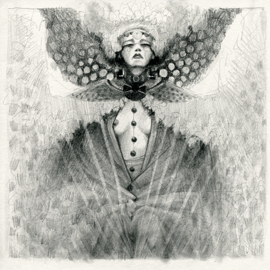 Cool how said white space doesnΒ΄t look just empty but like light or the sound of the flute that spreads! I love the design of the mask and details like that thereΒ΄s light right above his playing hands, or also the idea that even a divine creature needs a muse ... Nice how heΒ΄s connected to the girl whose expression is so lovely and vivid! And the "stigmata" on those hands are really interesting ...